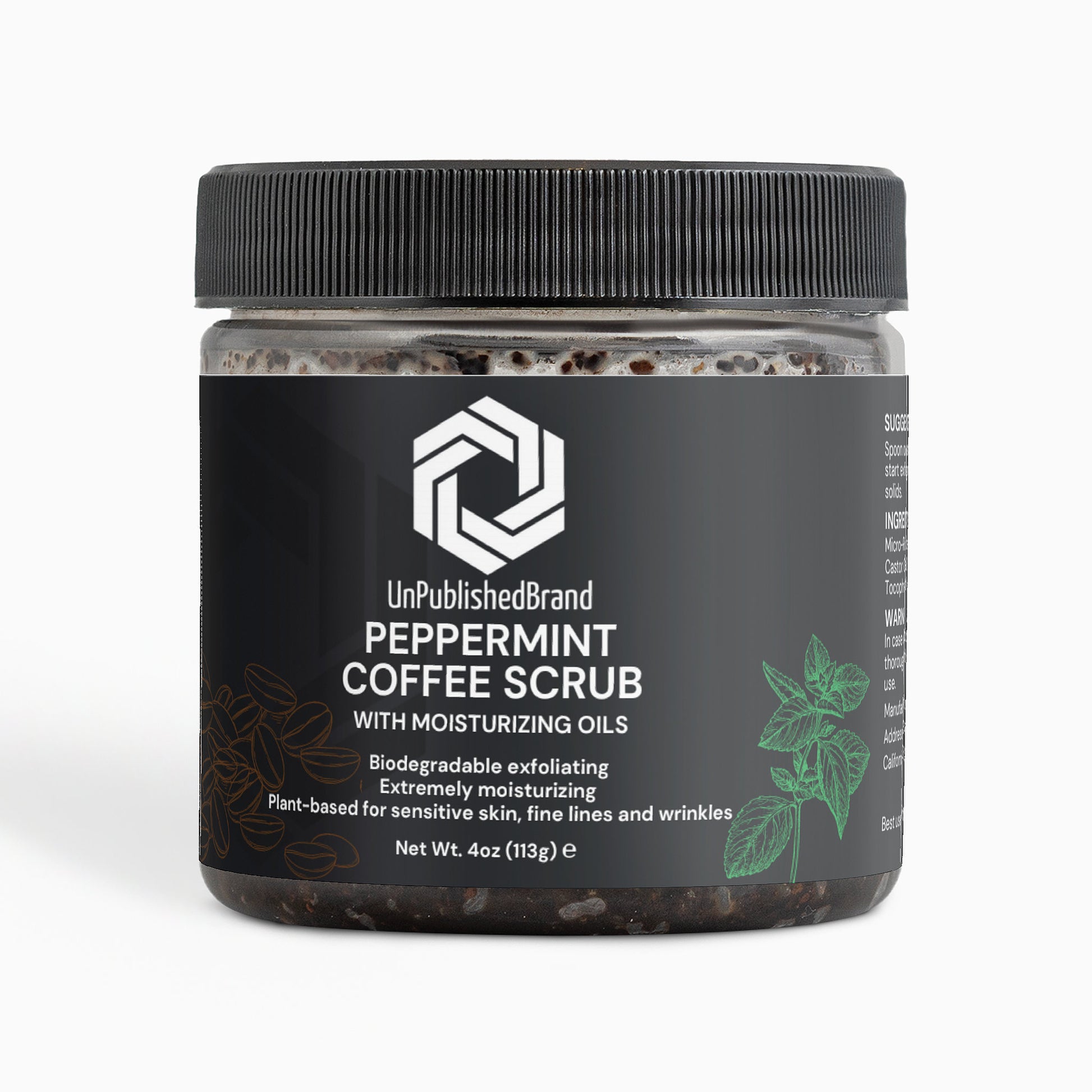 Ingredients: Micro-Roasted Coffee*+, Brown Sugar*+, Coconut Oil*+, Castor Oil*+, Sea Salt, Peppermint Essential Oil*, Tocopherol (Vitamin E)+ // *Organic +Food-Grade